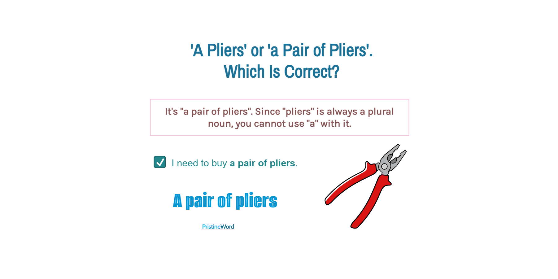 And remember, plural nouns, like "pliers", takes a plural form of a verb. Thus, we say "pliers are" (not "pliers is").