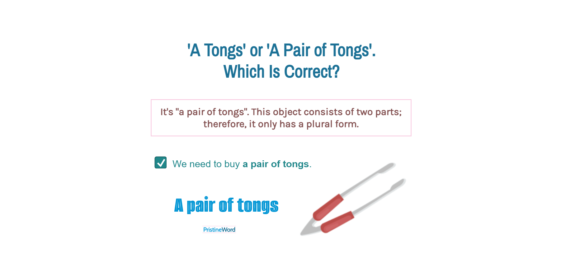 Keep in mind that this word requires a plural form of a verb. We say, for example, "tongs are/have" (not "is/has").
