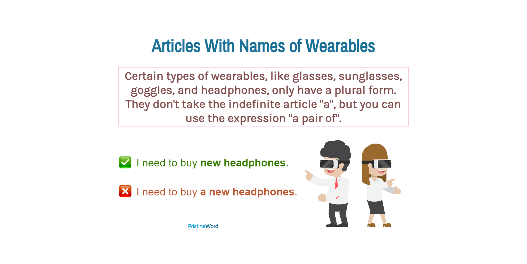 Certain types of wearables, like glasses, sunglasses, goggles, and headphones, only have a plural form.