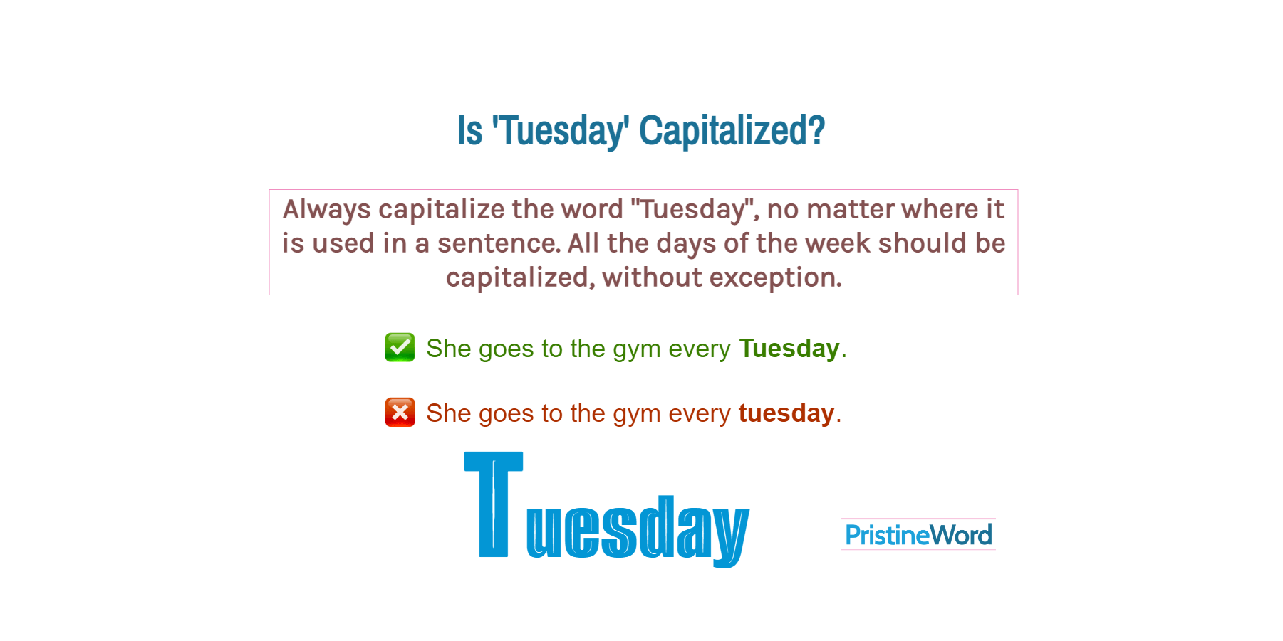 Why do we capitalize "Tuesday"? The days of the week are considered proper nouns. Thus, capitalization allows us to identify these words as unique entities.