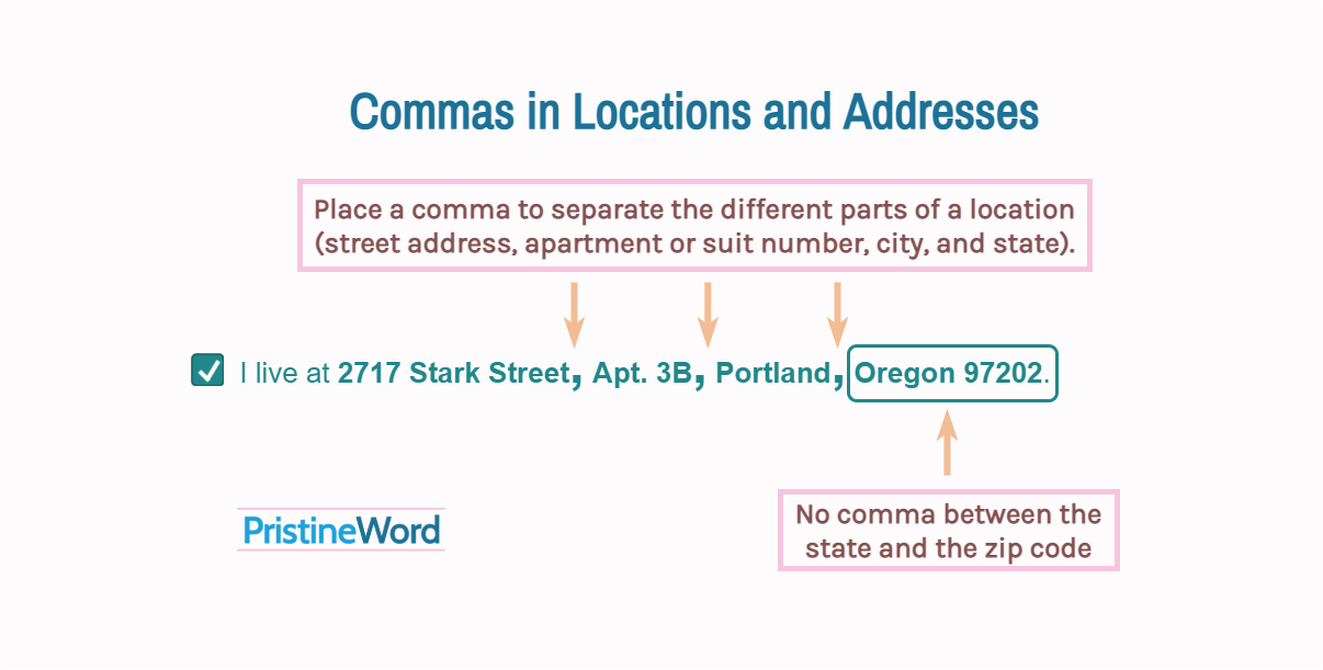 - Separate the different parts of the address (street address, apartment or suite number, city, and state) with a comma.