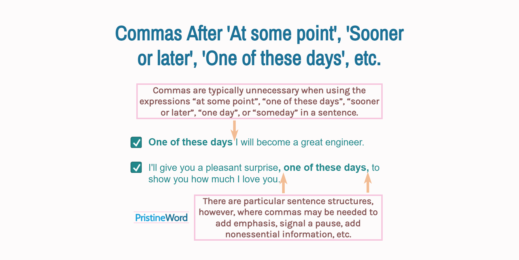 We do not need a comma after short introductory phrases (less than five words), such as “at some point”, “one of these days”, “sooner or later”, or “one day”.