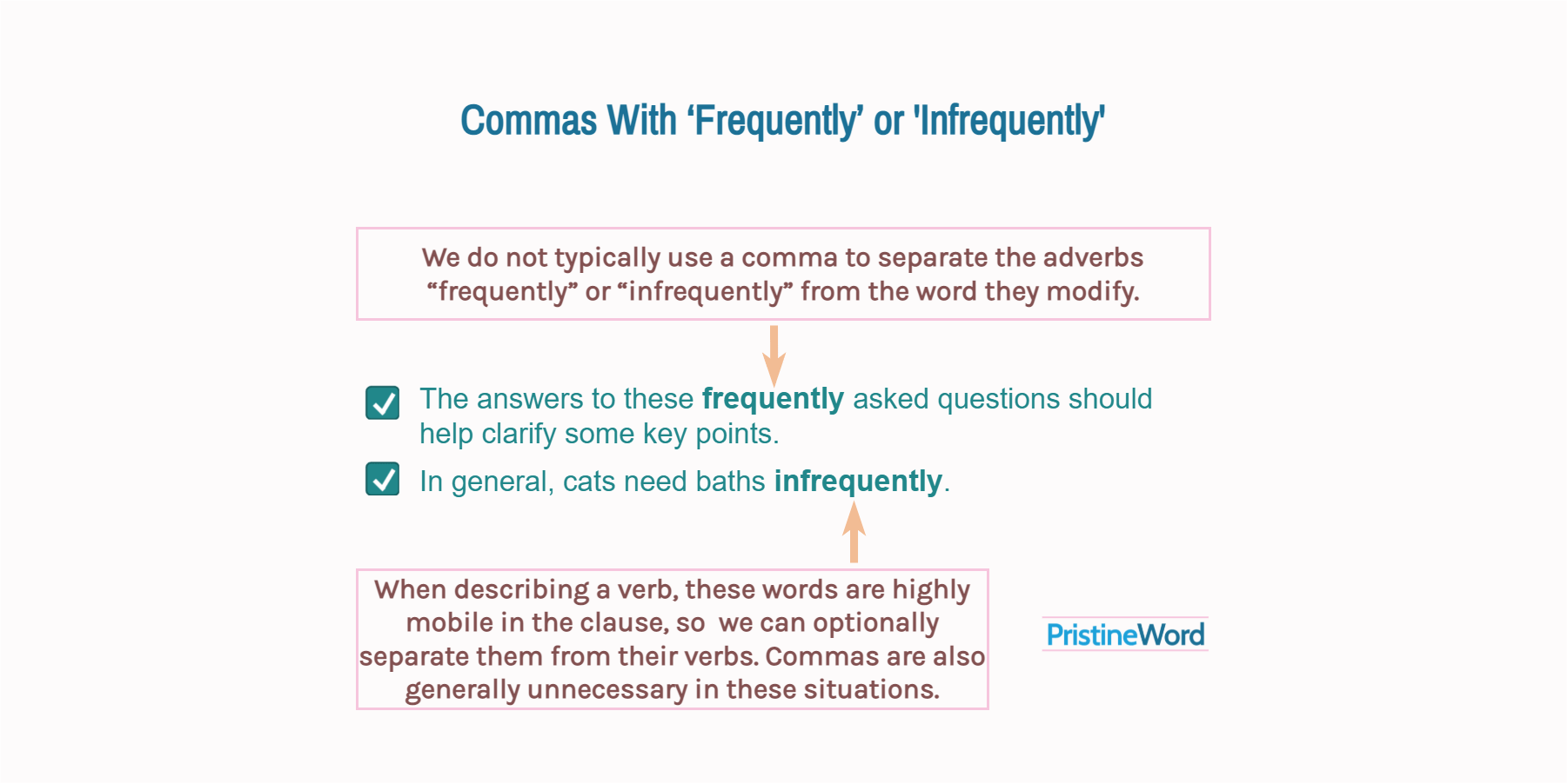 When describing a verb, “frequently” and “infrequently” are highly mobile in the clause; thus, we can optionally separate these words from their verbs where commas are also generally unnecessary.