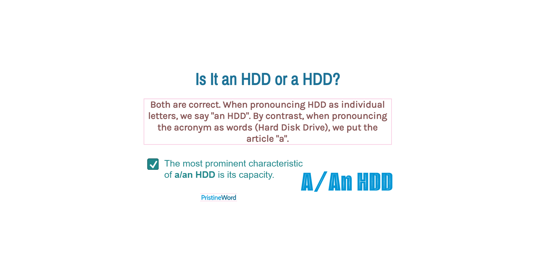 Both are correct. When pronouncing HDD as individual letters, we say "an HDD" because the "h" starts with a vowel sound (similar to "eich"). By contrast, when pronouncing the acronym as words (Hard Disk Drive), we put the article "a" (the consonant "h" is clearly pronounced).