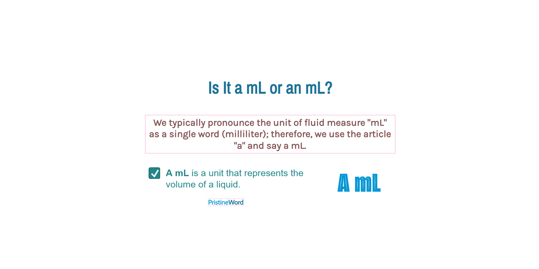 We typically pronounce the unit of fluid measure "mL" as a single word (milliliter); therefore, we use the article "a" and say a mL. Remember, we use "a" before words that begin with a consonant sound, like mL or milliliter.