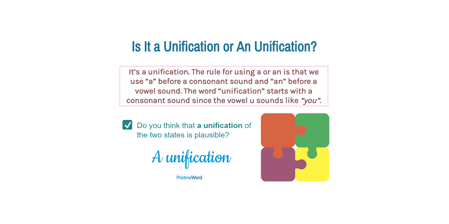 It’s a unification. The rule for using “a” or “an” is that we use “a” before a consonant sound and “an” before a vowel sound. The word “unification” starts with a consonant sound since its first letter (u) sounds like “you”.