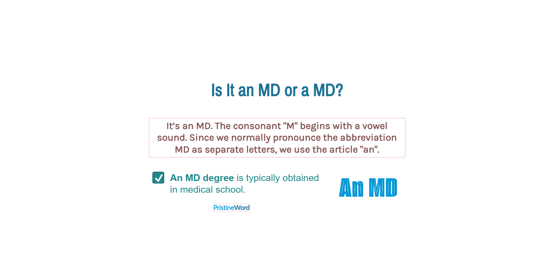 It’s an MD. Remember, the consonant "M" begins with a vowel sound. Since we normally pronounce the abbreviation MD as separate letters, we use the article "an".