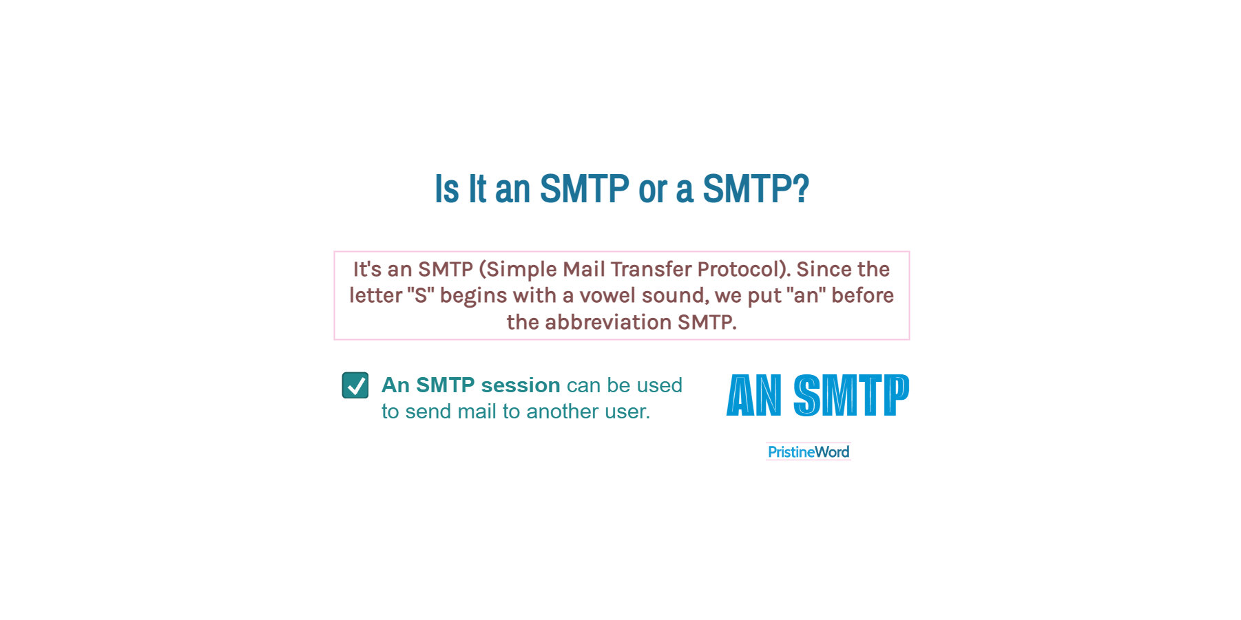 It's an SMTP (Simple Mail Transfer Protocol). Since the letter "S" begins with a vowel sound, we put "an" before the abbreviation SMTP.