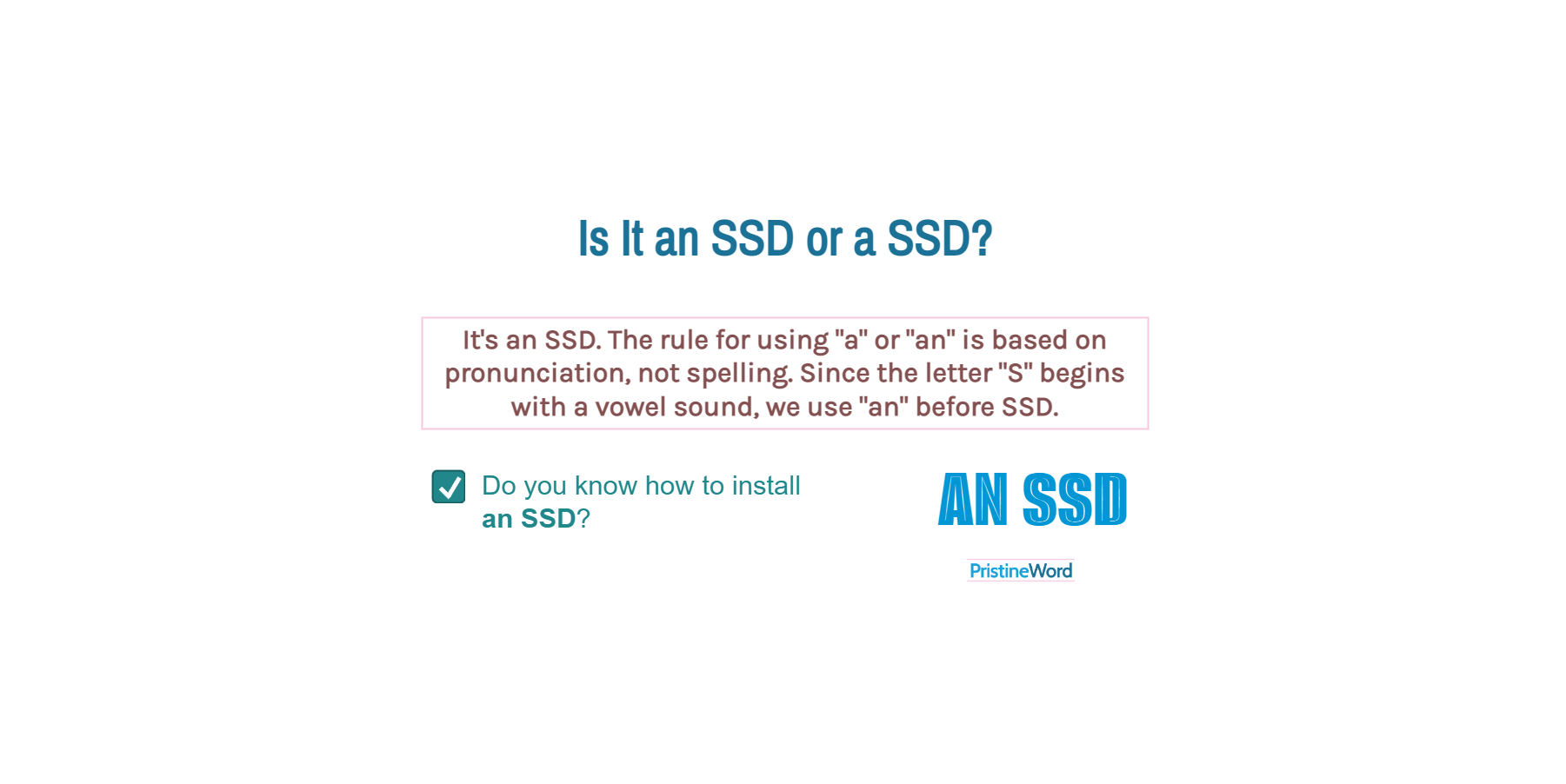 It's an SSD (Solid-State Drive). The rule for using "a" or "an" is based on pronunciation, not spelling. Since the letter "S" begins with a vowel sound, we use "an" before SSD.