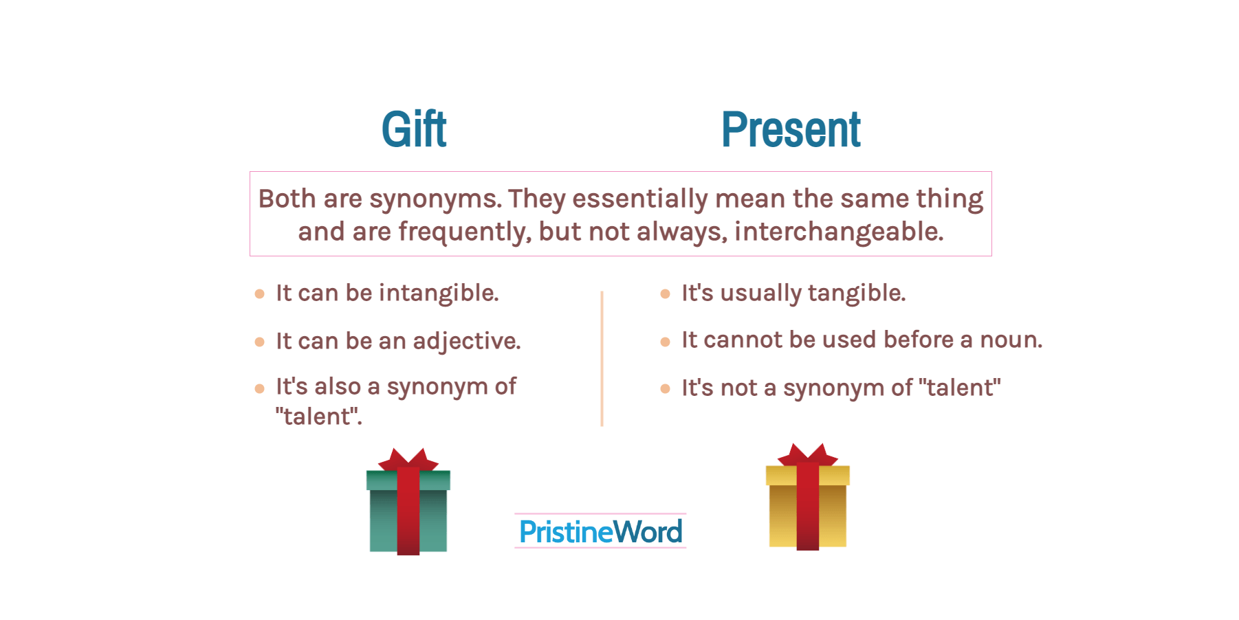 The nouns "gift" and "present" are synonyms. They essentially mean the same thing and are frequently, but not always, interchangeable.