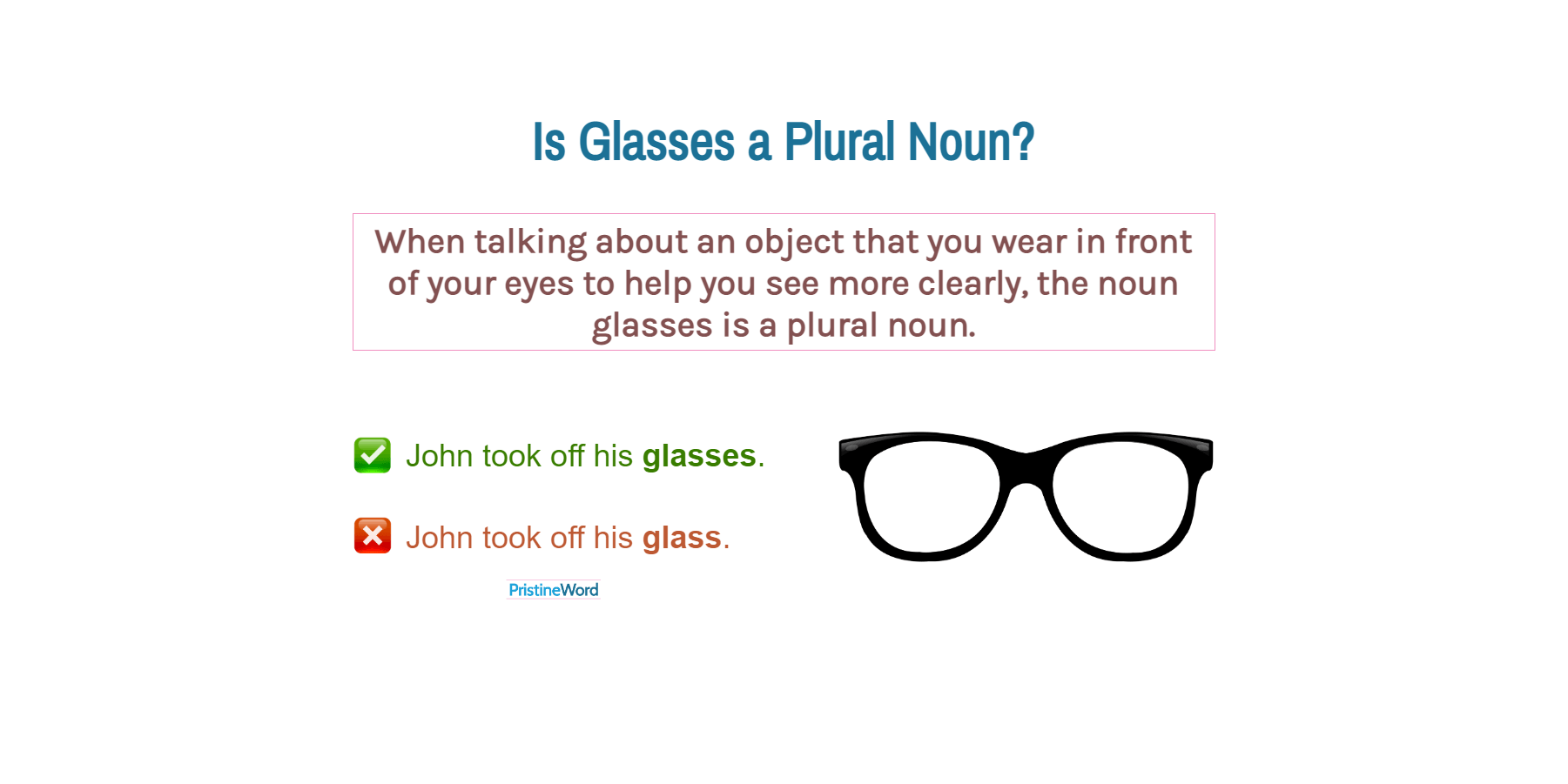 When talking about an object that you wear in front of your eyes to help you see more clearly, the noun glasses is a plural noun. These nouns only have a plural form and are grammatically plural.