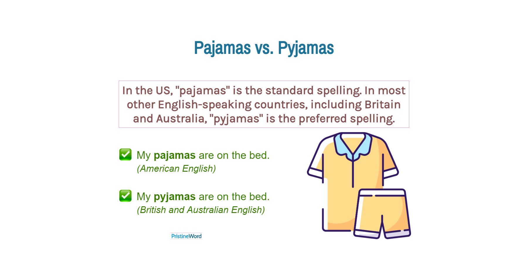 - In most other English-speaking countries, "pyjamas" is the preferred spelling.