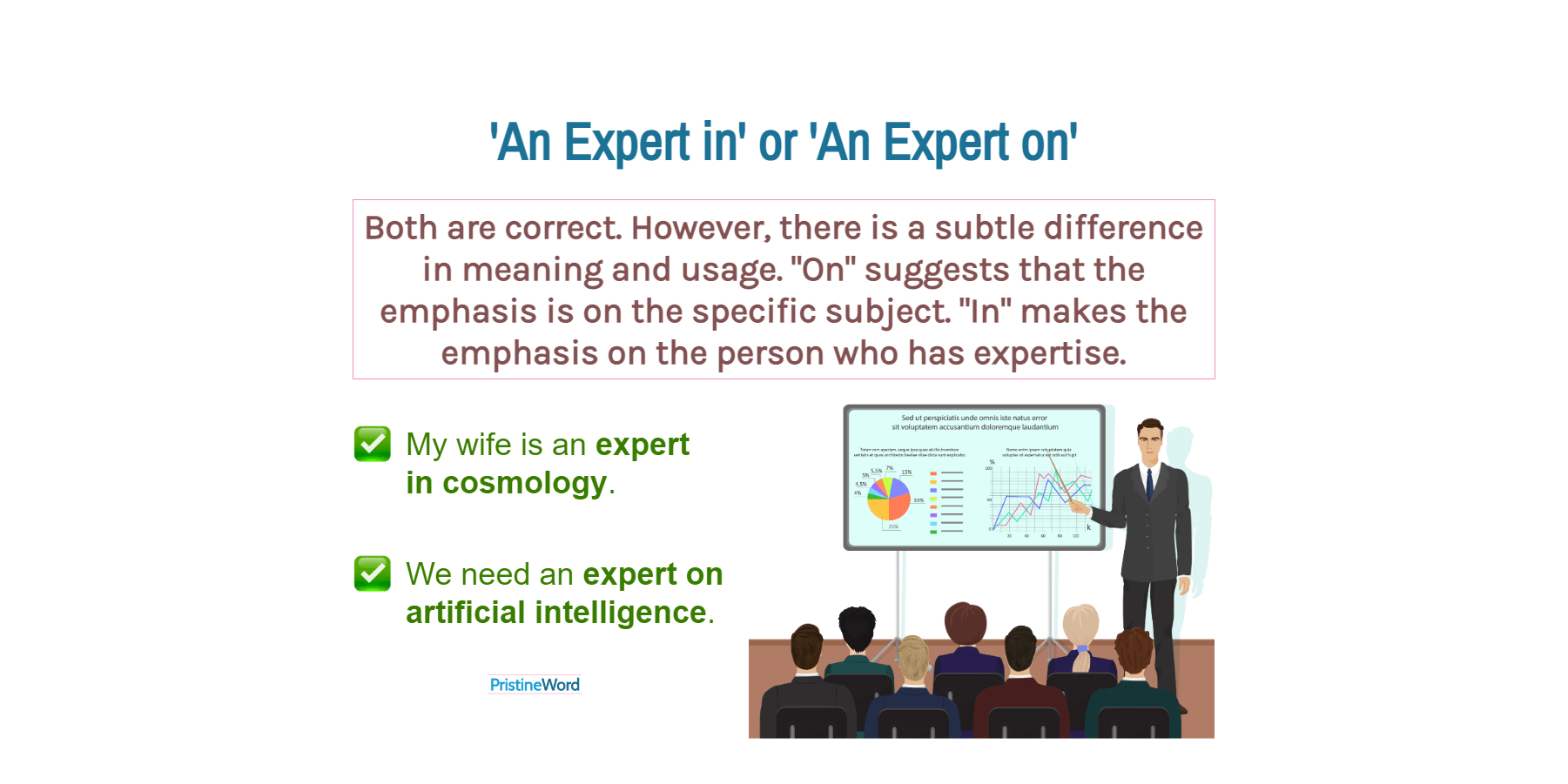 Both are correct. You can say "be an expert in" or "be an expert on". However, when choosing between the two prepositions, there is a subtle difference in meaning and usage to consider. While "on" suggests that the emphasis is on the specific subject or area of expertise, "in" makes the emphasis on the person who has expertise.