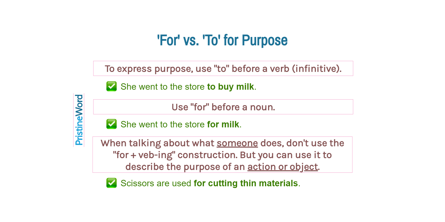 To express purpose, use "to" before a verb (infinitive). Use "for" before a noun. When talking about what someone does, don't use the "for + veb-ing" construction.