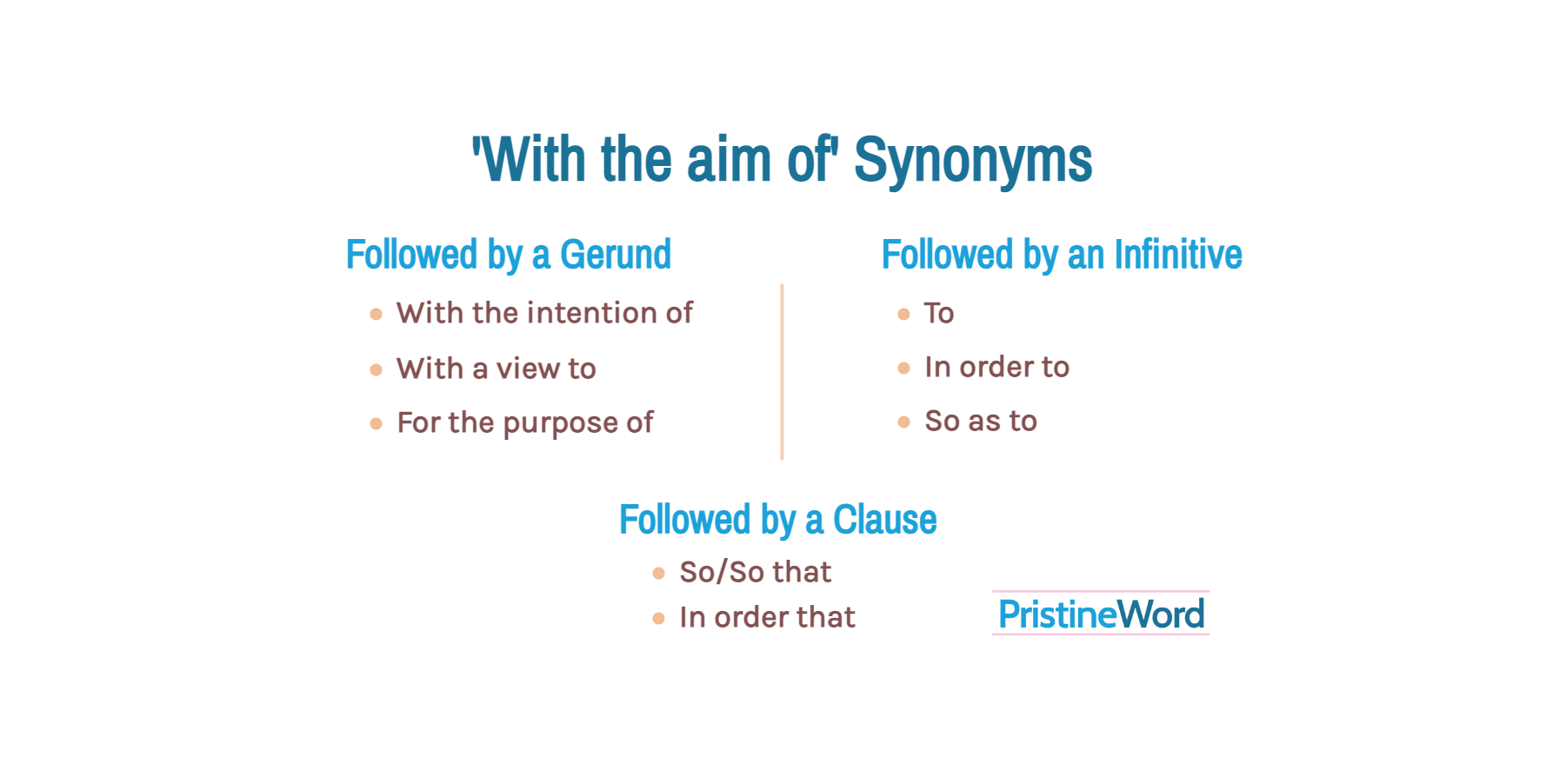 With the intention of, with a view to, for the purpose of, to, in order to, so as to, so that, in order that.