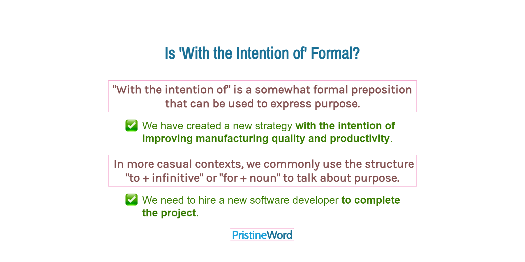 You can use "with the intention of" in formal and semiformal contexts. In everyday English or casual situations, by contrast, we commonly use the structure to + infinitive or for + noun to talk about purpose.