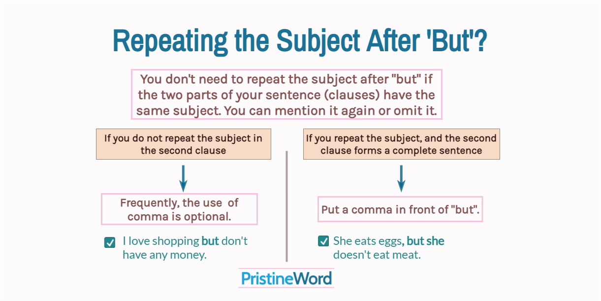 You can choose whether to repeat the subject pronoun after but by considering a range of factors, including emphasis, rhythm, stress, and clarity.