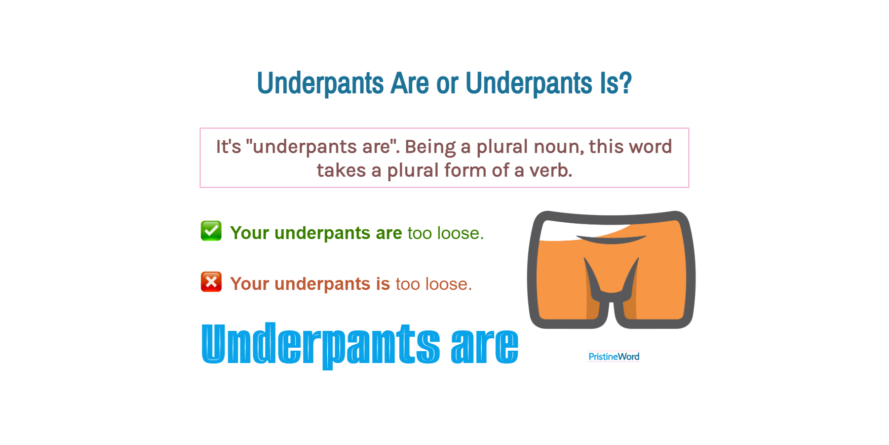 It's "underpants are". Being a plural noun, this word takes a plural form of a verb. In American English, "underpants" is a term that can be used to talk about both women's and men's underwear. In British English, however, this word refers to only men's underwear.